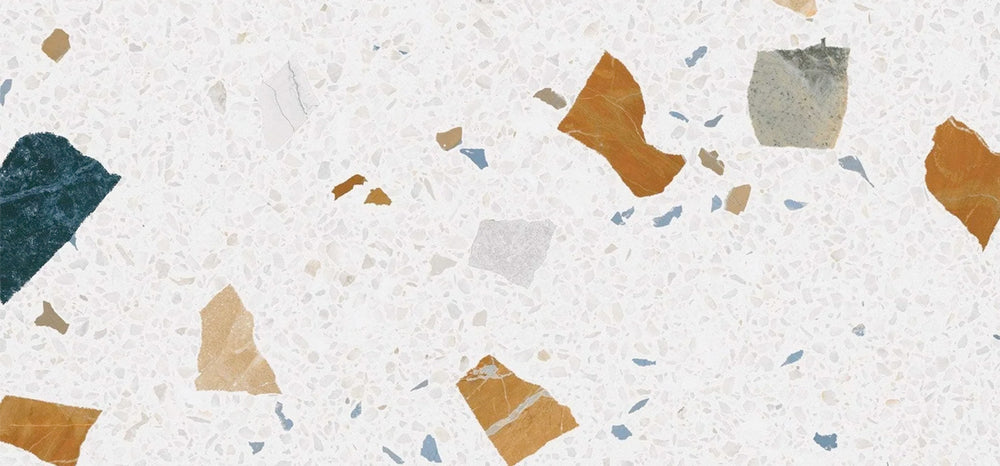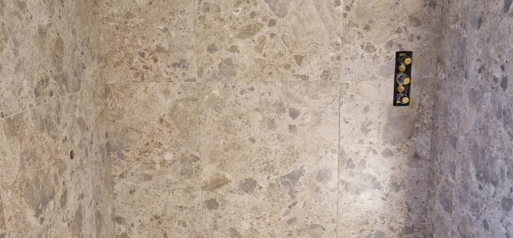 Contemporary porcelain terrazzo style Montage tile really brings this shower room to life. Beautifully complimented with Mapei grout