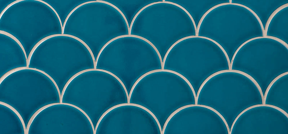 Scalloped tile feature wall with a hand crafted bold scallop tile in lush blue-green
