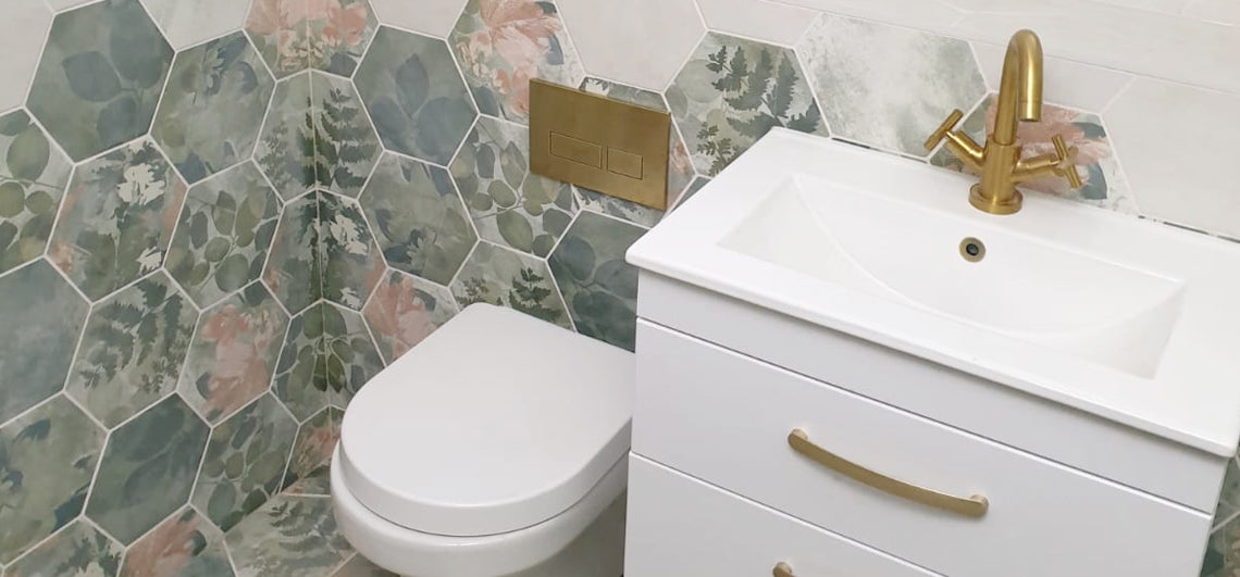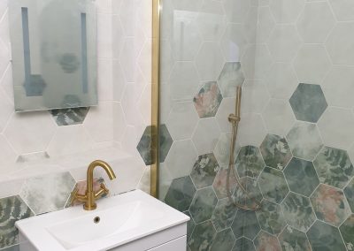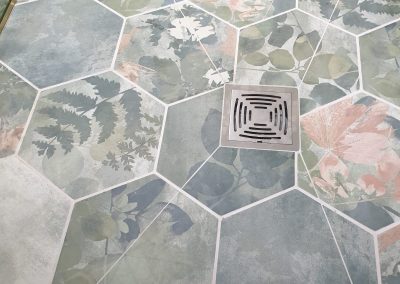 We designed, supplied and fitted this beautiful bathroom in Kenwyn, Truro. Our clients selected these wonderful Woodland Glade hexagon tiles by the National Trust that come in a 21.5 x 24.5 cm format. The colour choice was Woodland Glade Porcelain ‘Melange Green’ complimented by Woodland Glade Porcelain ‘Shadow White Field’.